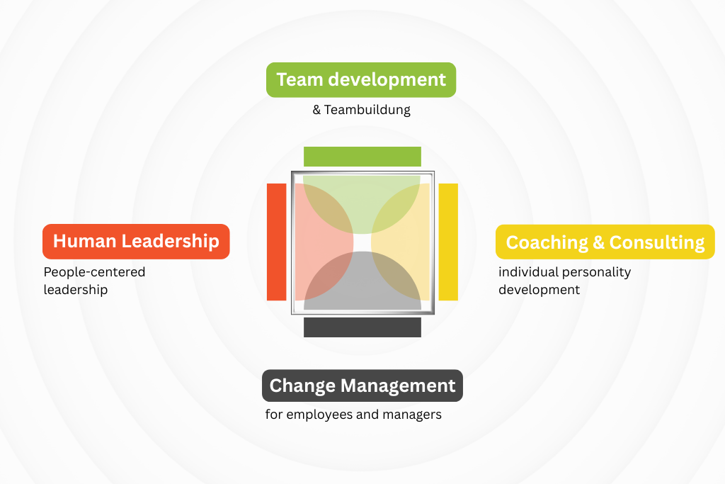 Our successful model combines Team development, leadership, change management and individual coaching into a holistic cycle. The four elements interlock and create sustainable change.